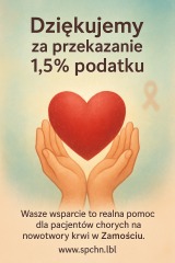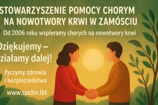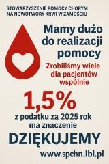 Dziękujemy za wsparcie za 20 lat współpracy na rzecz pacjentów z chorobami hematologicznymi i ich rodzin czas mija szybko kolejny rok już jest życzymy Państwu dużo zdrowia bezpieczeństwa wszystkiego najlepszego a w szczególności naszym darczyńcom przekazującym 1,5% podatku ma to wielkie znaczenie dla nas .Zapraszamy do dalszej współpracy w 2026 roku i rozliczenia podatku dla chorych leczonych na Oddziale Hematologicznym Zamojskiego Szpitala Niepublicznego / wykaz zakupów https://www.spchn.lbl.pl/wspieraj-nas/wykaz-wyposazenia /oraz odwiedzania naszej strony internetowej i facebooka www.spchn.lbl.pl Dziękujemy Zarząd Komisja Rewizyjna SPCHN